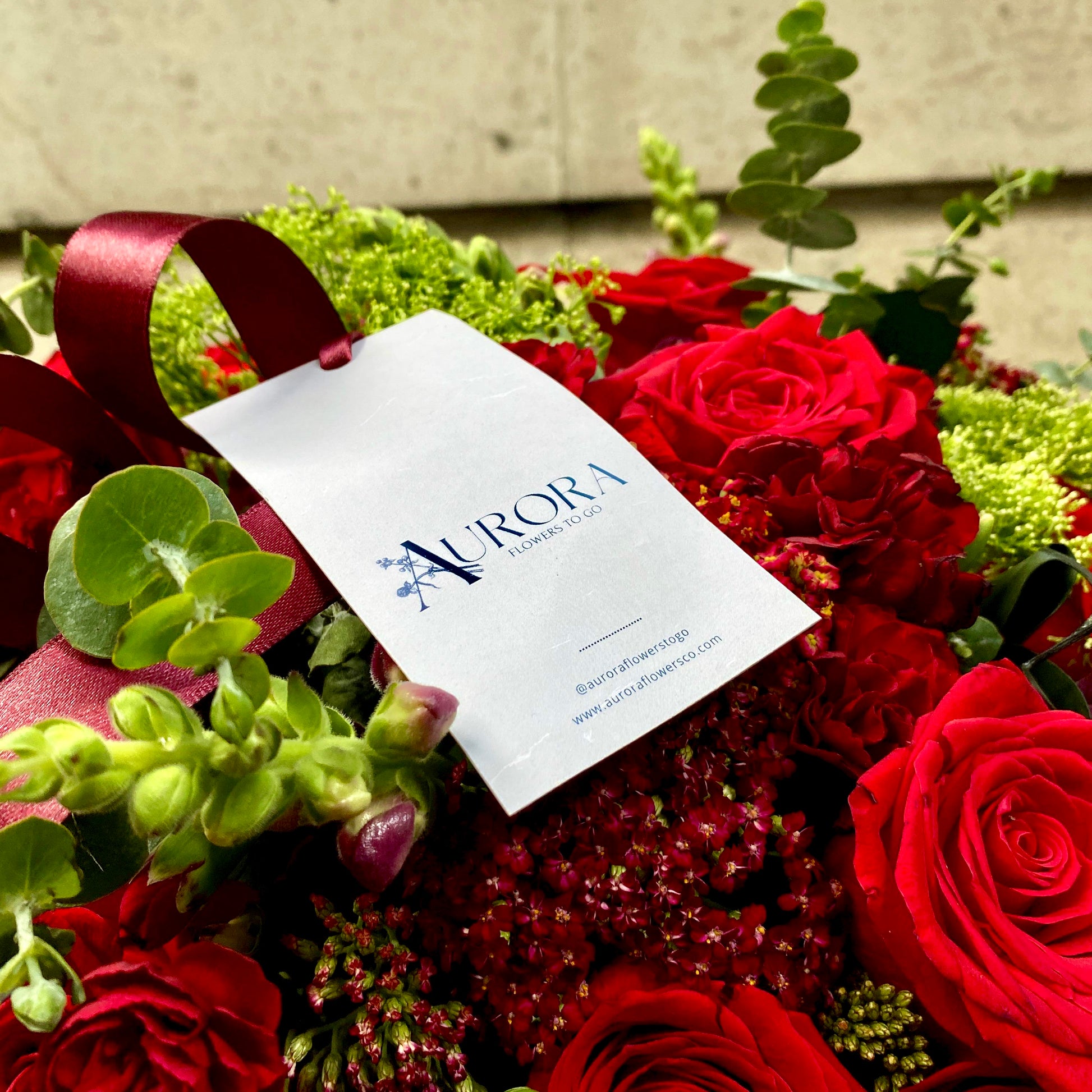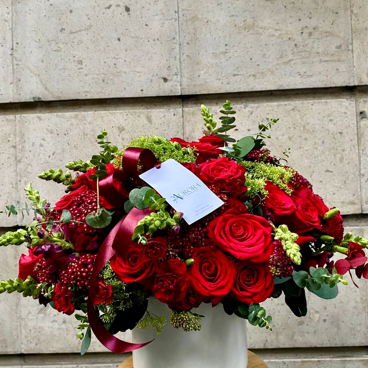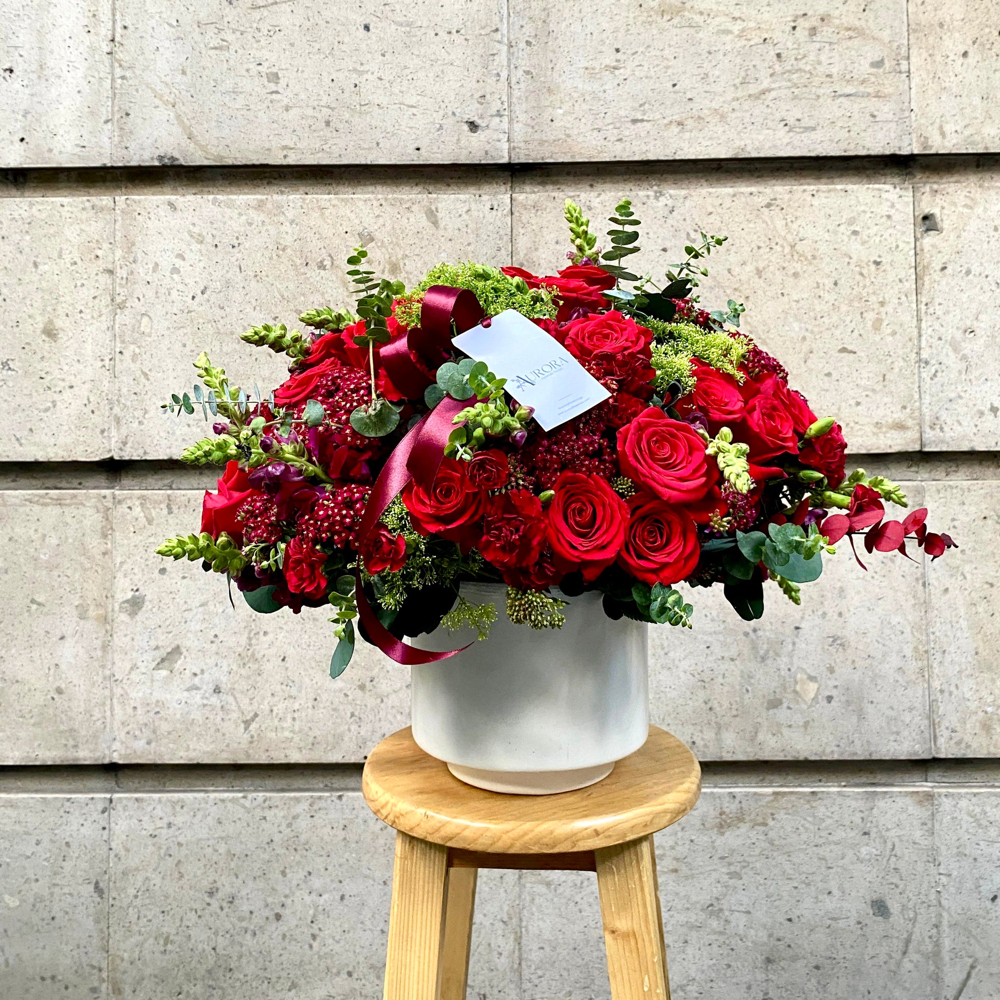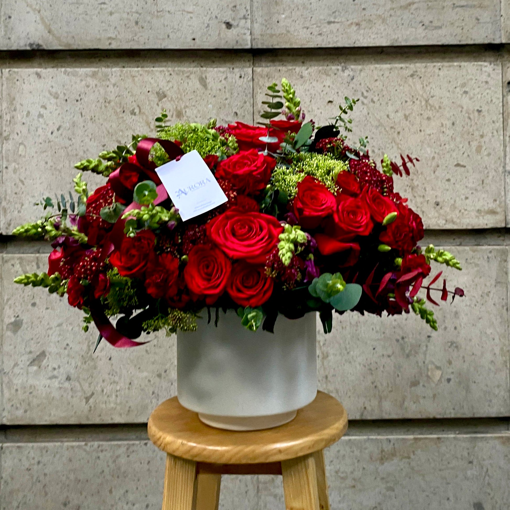 Este arreglo en copa está compuesto por una selección de flores frescas en tonos rojos intensos, cuidadosamente diseñadas para crear una pieza sofisticada, con fuerza y presencia.