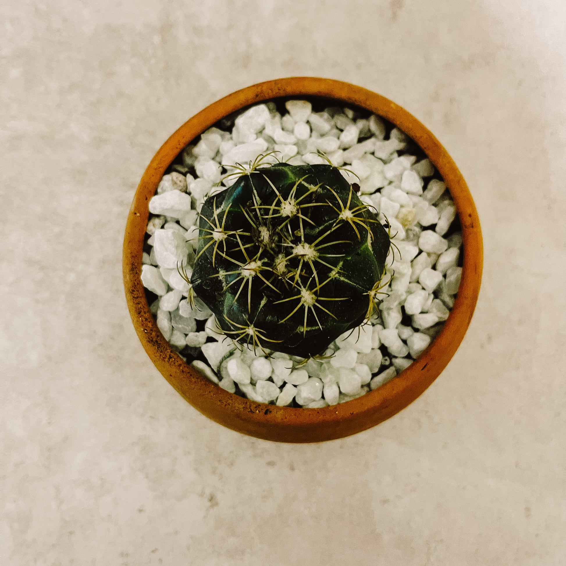 Este cactus ornamental (género Gymnocalycium, de bajo mantenimiento) se presenta en una maceta de cerámica redonda en tono amarillo mostaza, con acabado mate y detalles de piedras blancas decorativas que realzan su verde intenso.