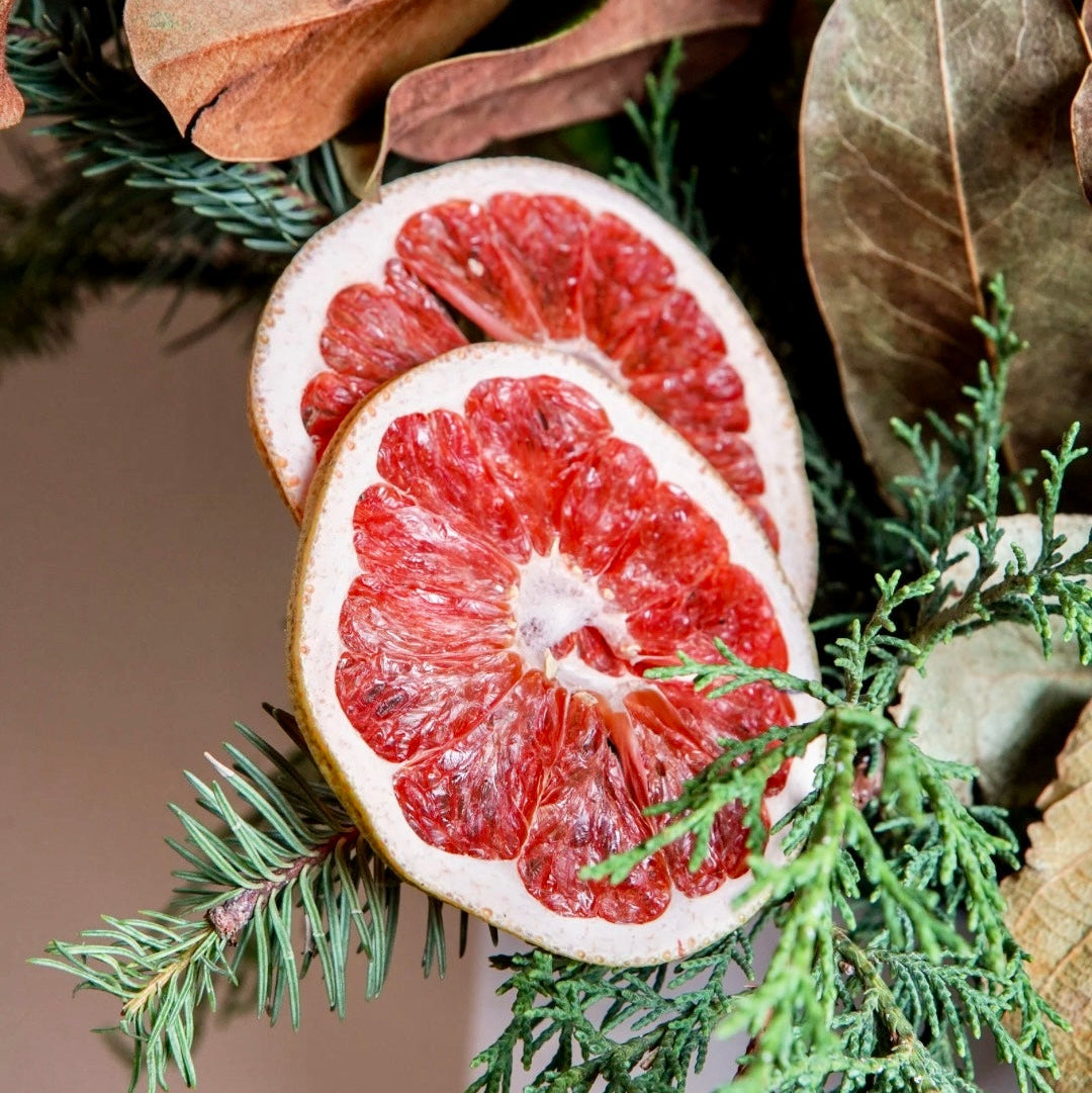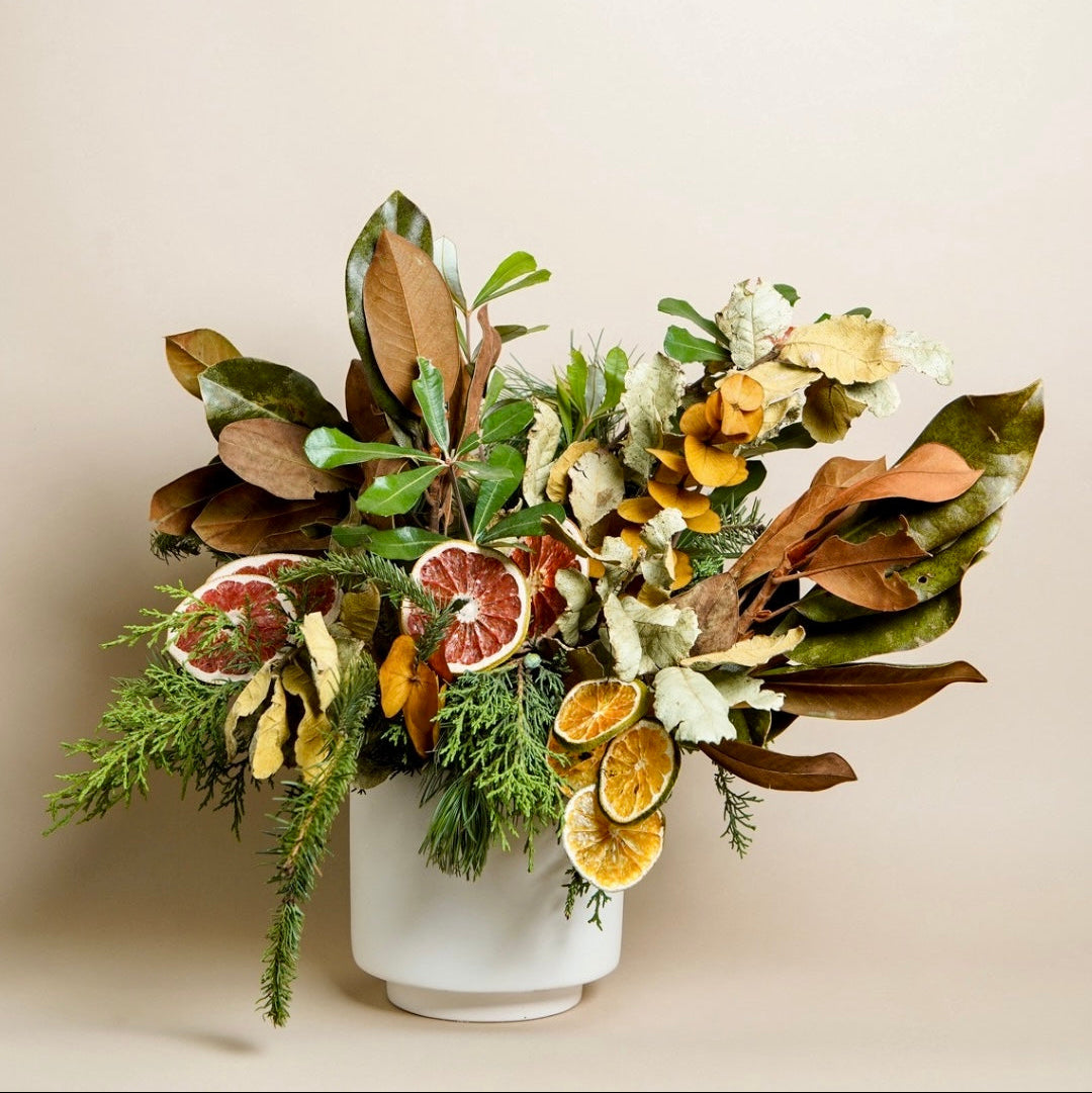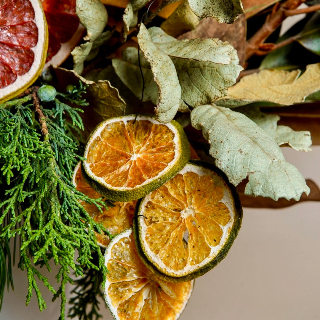 Un arreglo único que celebra la esencia invernal con una mezcla de texturas, aromas y colores naturales. Elaborado con follajes permanentes de alta calidad, ramas de pino, hojas de magnolia y acentos de cítricos deshidratados como naranja y toronja, creando un estilo orgánico, elegante y contemporáneo.