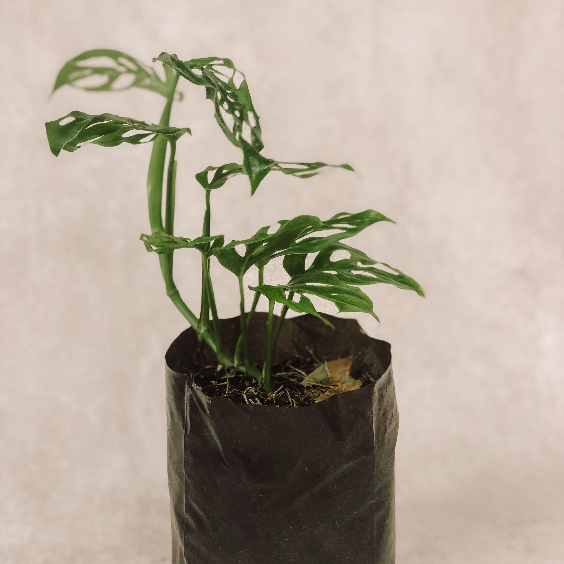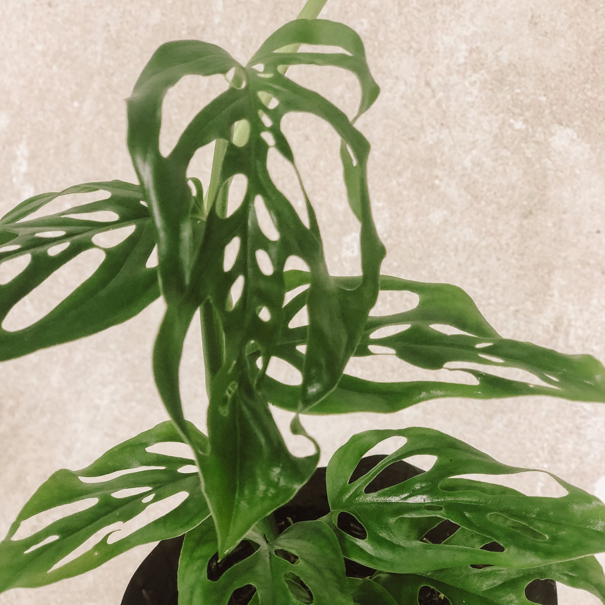 Esqueleto, también llamada Monstera Adasonii, es una planta trepadora endémica de Sudáfrica. Con raíces y tallos medianos, puede crecer en cascada o en maceta con un ritmo de crecimiento lento pero constante. Las hojas nacen enteras y sólo al madurar presentan agujeros de forma ovalada en un tono verde profundo. Su resistencia a los vientos tropicales y facilidad de cuidado la hacen ideal para cualquier hogar.